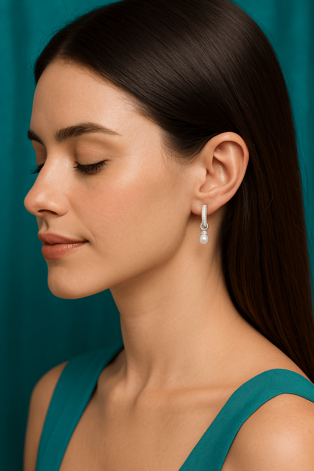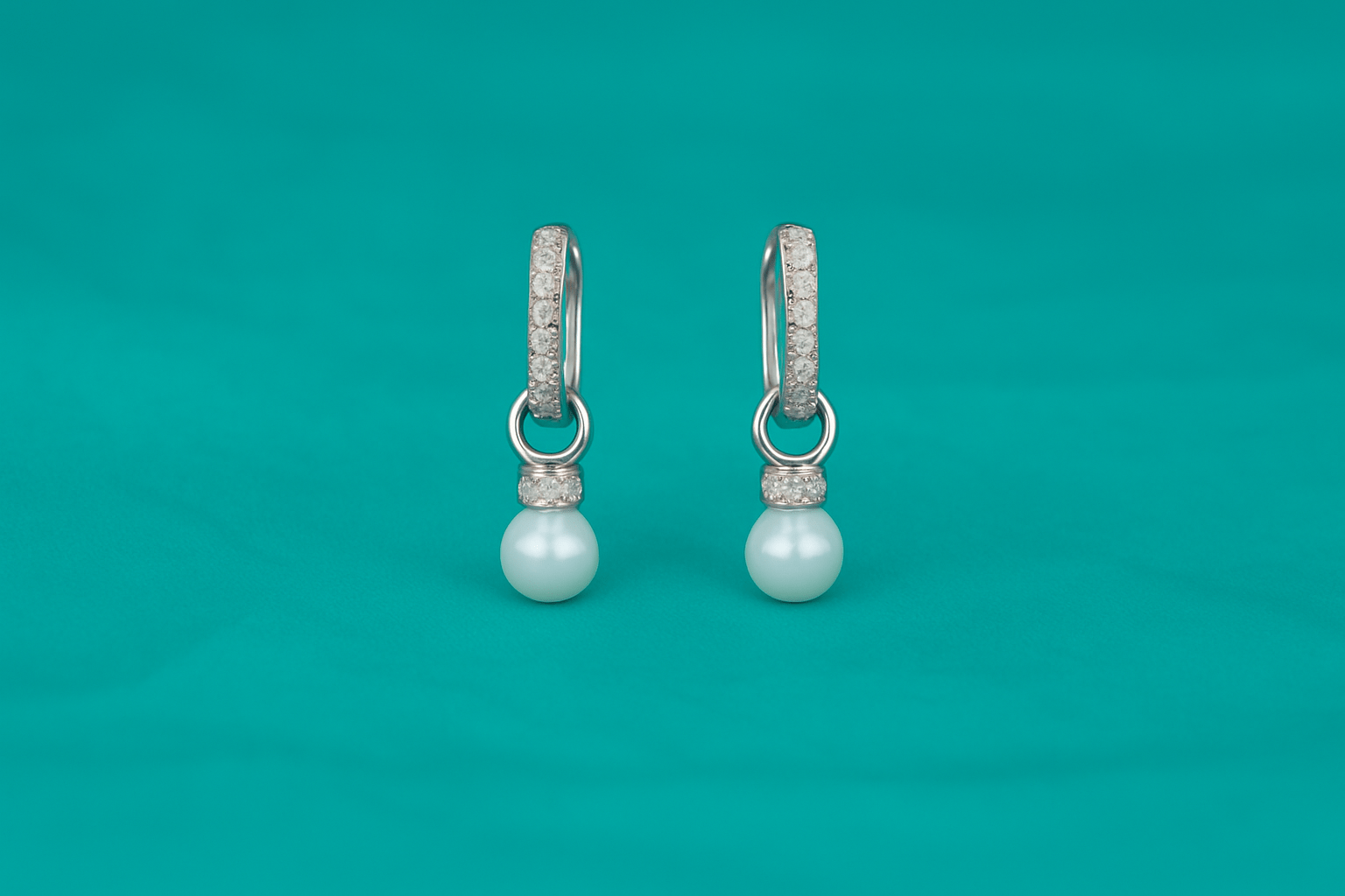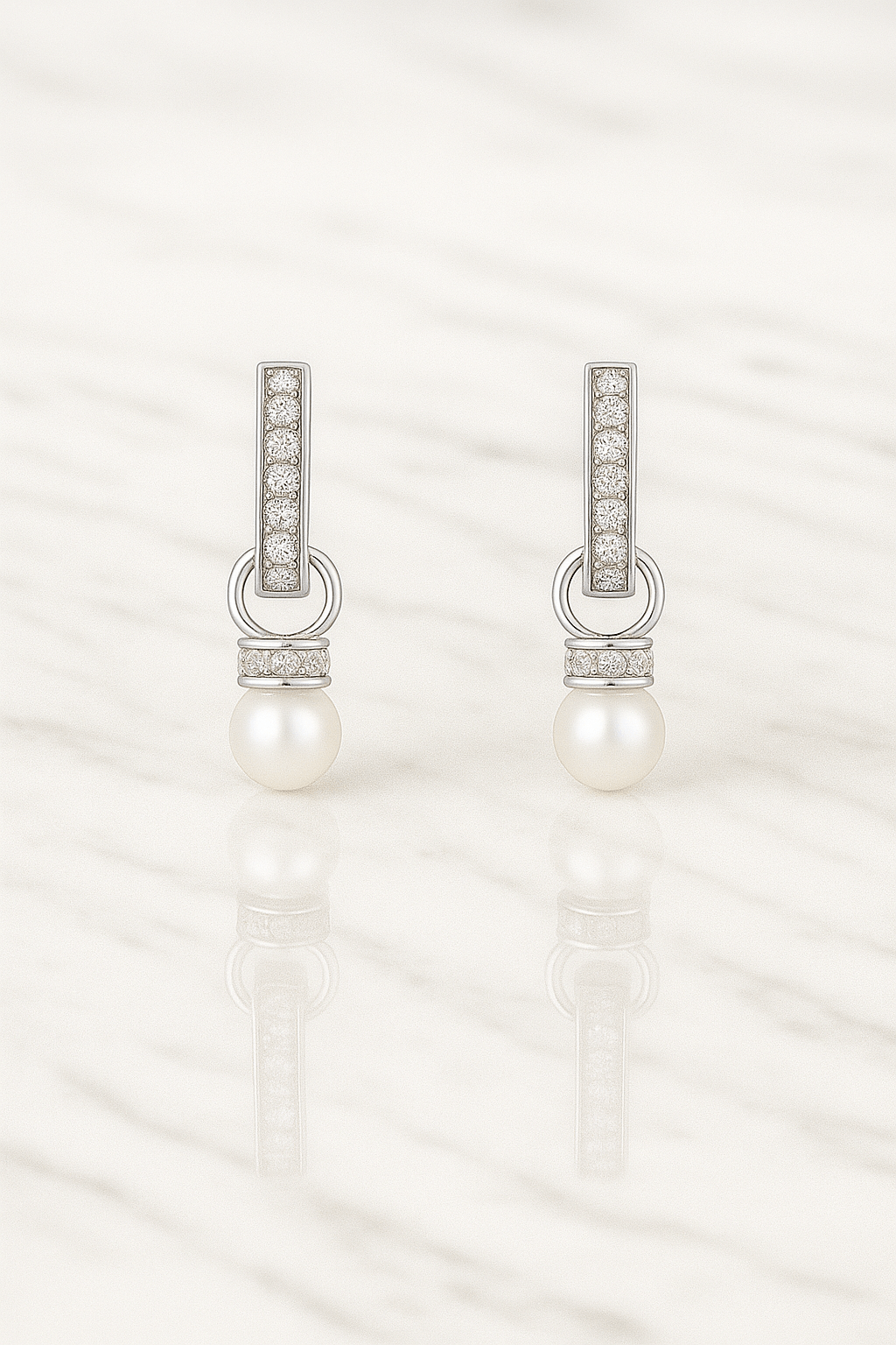 - Design: Rectangular hinged hoops with detachable pearl drop