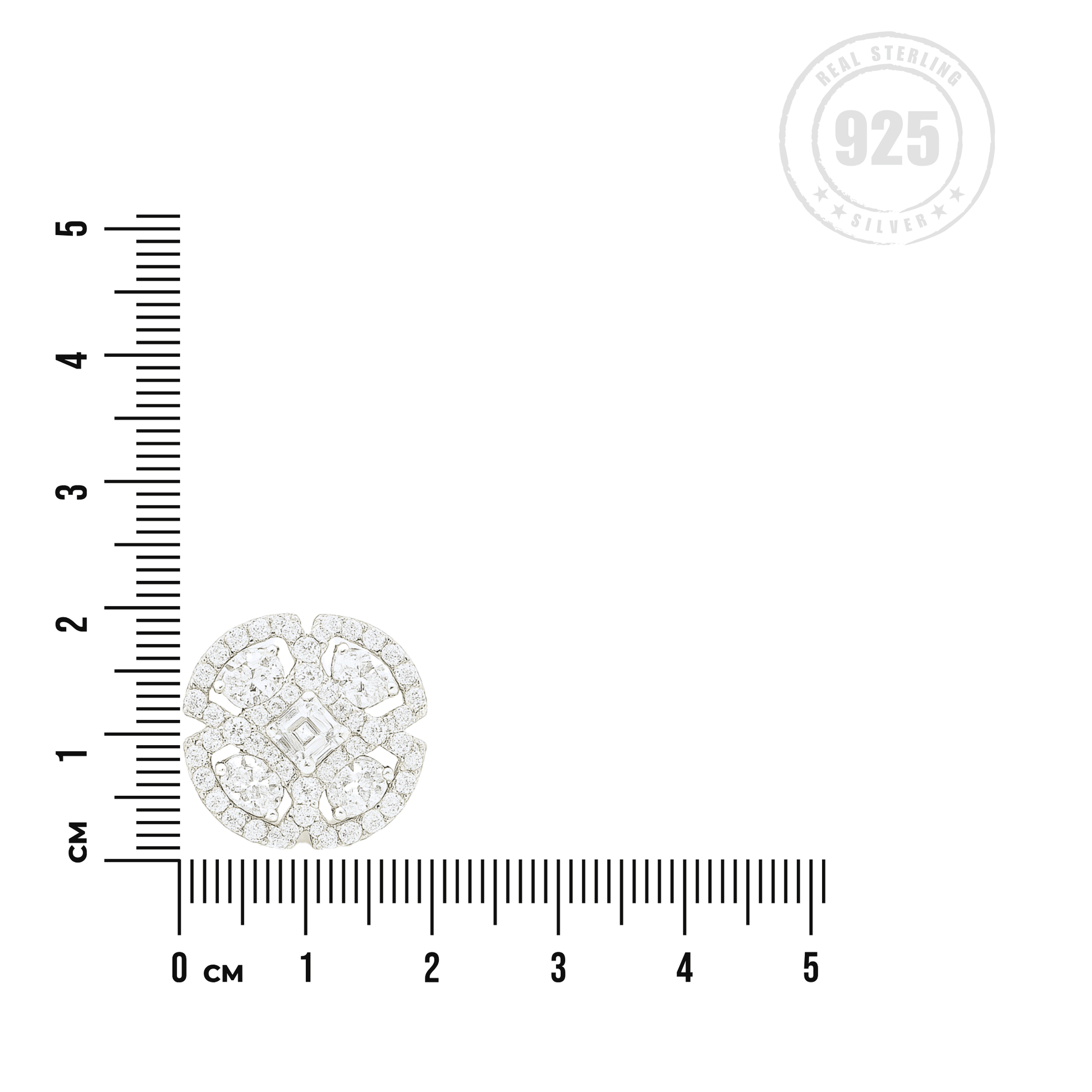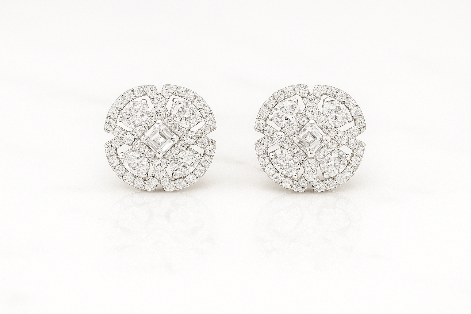 The central square-cut zircon is framed by four pear and round brilliant-cut zircons, arranged in a symmetrical pattern reminiscent of royal crests. The entire motif is surrounded by a delicate pavé halo, adding extra brilliance and sophistication. A perfect balance of heritage elegance and modern finesse, these earrings are ideal for weddings, grand occasions, or elevating your evening look.