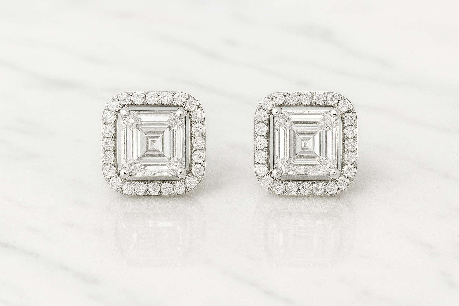 Let your elegance speak with these radiant square-cut halo studs — a modern classic you’ll treasure forever.