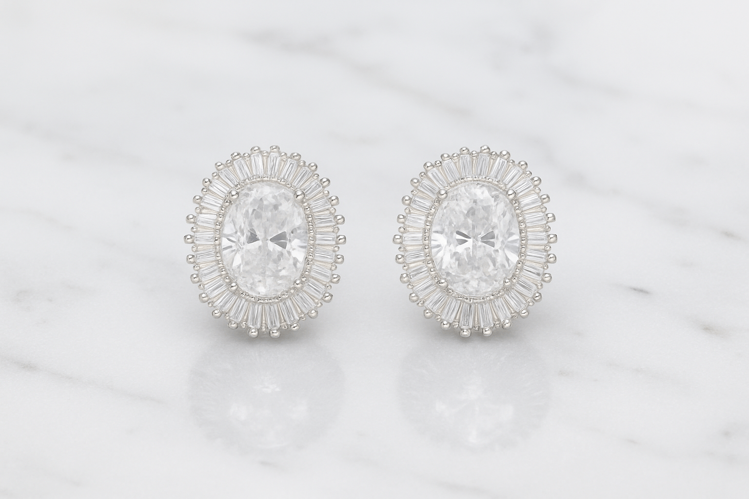 Turn heads with the brilliance of our Regal Radiance Oval Halo Earrings, crafted from high-quality 925 sterling silver and encrusted with premium AAA-grade cubic zirconia. These earrings feature a captivating oval-cut centerpiece, surrounded by a double halo of baguette and round-cut zircons that mimic the grandeur of fine diamonds.