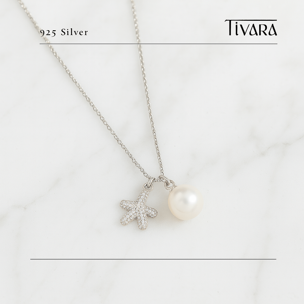 Embrace the beauty of ocean-inspired elegance with the Starfish & Simulant Pearl Charm Necklace by Tivara. Thoughtfully crafted in pure 92.5 sterling silver, this necklace features a graceful duo—an intricately detailed starfish charm studded with sparkling cubic zirconia, paired with a high-luster simulant pearl that mirrors the glow of natural sea pearls.